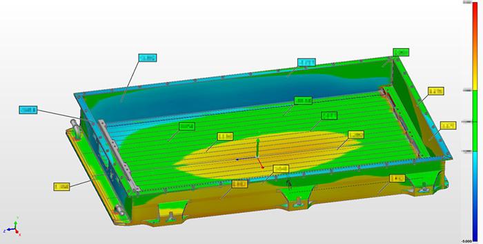 電池底板孔位及外型尺寸,掃描耗時5分鐘,完成數(shù)據(jù)檢測及報告,耗時10分鐘,并且掃描作業(yè)及檢測過程可實現(xiàn)自動化,一鍵可完成自動化出檢測報告。